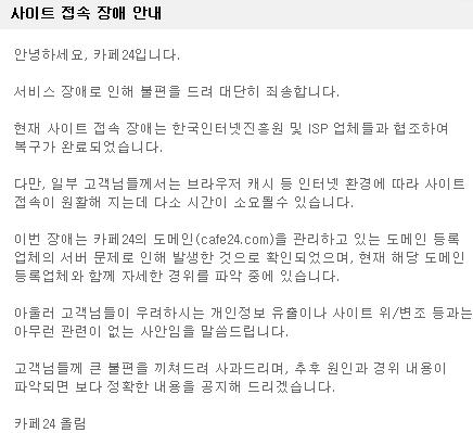 카페24 관계자는 “카페24 서버가 해킹당한 것이 아니다. 카페24의 DNS를 관리하고 있는 업체에서 문제가 발생한 것으로 확인되었으며 현재 해당 업체에서 자세한 경위를 파악하고 있고 곧 공식입장을 밝힐 것으로 알고 있다.”고 전했다.