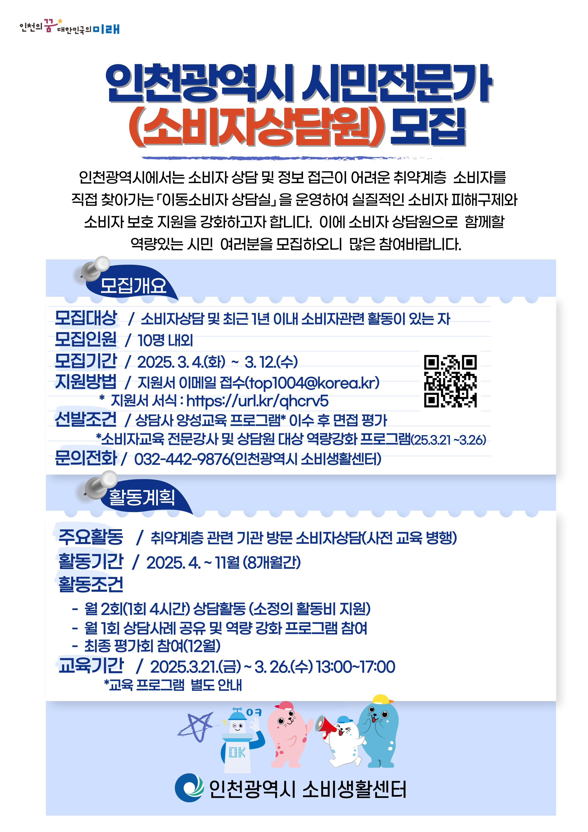 이를 위해 인천시는 3월 중 소비자 상담원을 모집한다. 모집 대상은 소비자 상담 경험이 있거나 최근 1년 이내 관련 활동을 한 사람으로, 교육을 이수한 후 면접을 통해 최종 선발된다.