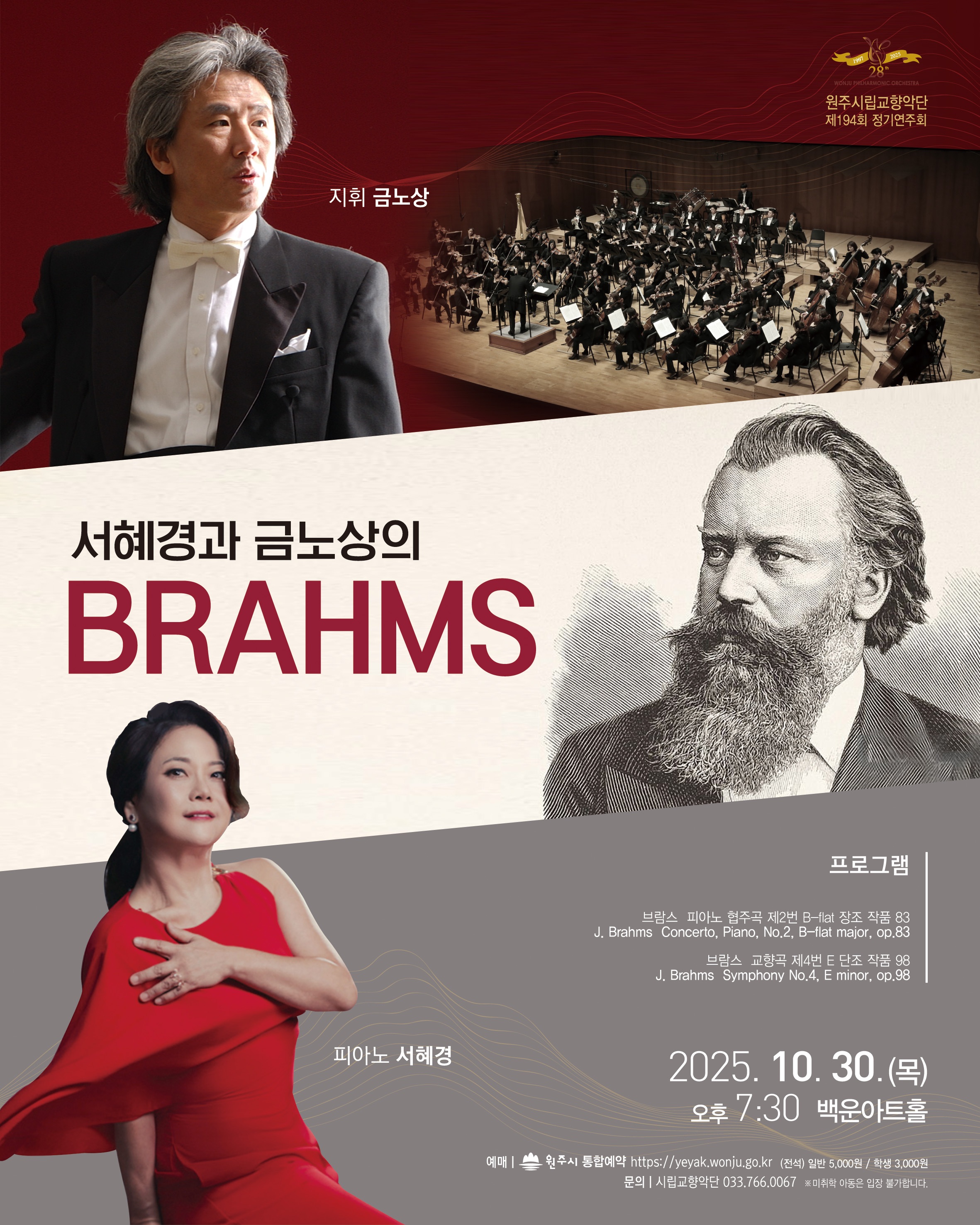 [어니스트뉴스. 뉴스기사검증위원회] 손시훈 기자 = 원주시립교향악단은 오는 30일 오후 7시 30분, 백운아트홀에서 제194회 정기연주회 ‘서혜경과 금노상의 브람스(BRAHMS)’를 개최한다. 이번 연주회에서는 한국 교향악단의 대표 지휘자인 금노상과 세계적인 피아니스트 서혜경이 출연해 ‘브람스 피아노협주곡 제2번’과 ‘브람스 교향곡 제4번’을 연주한다. 피아노협주곡 제2번은 브람스의 완벽주의가 극명하게 드러난 작품으로, 교향곡처럼 네 악장으로 구성돼 특유의 대위법과 교향적 전개 방식이 돋보이는 곡이다. 교향곡 제4번은 브람스의 마지막 교향곡으로, 드라마틱하고 열정적인 1악장과 레퀴엠 분위기의 2악장, 트라이앵글이 들어간 3악장, 샤콘느의 4악장으로 구성된다. 공연 예매는 원주시 통합예약플랫폼(y...