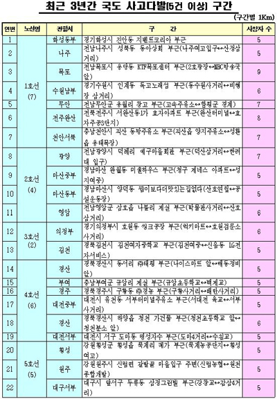 ※ “사고다발구간”은 1km 구간에서 최근 3년간 5명 이상 사망한 사고위험이 높은 국도구간