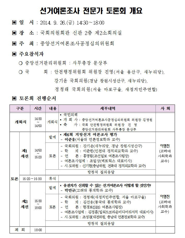 토론회는 중앙선거여론조사공정심의위원회 김영원 위원장의 개회사와 국회 안전행정위원회 진영 위원장과 중앙선거관리위원회 문상부 사무총장의 축사를 시작으로 2개 세션으로 나누어 진행되며, 토론회 사회는 고려대 사회학과 이명진 교수가 맡는다.